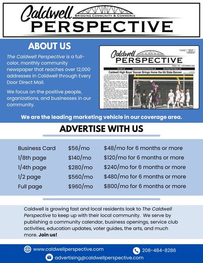Advertising rates are much more affordable than other advertising avenues and provide a return on your investment. For more pricing information, download the media kit at the bottom of this page, email advertising@caldwellperspective.com or call Toni Ferro at (208) 484-8286 to make an appointment to visit about your goals.